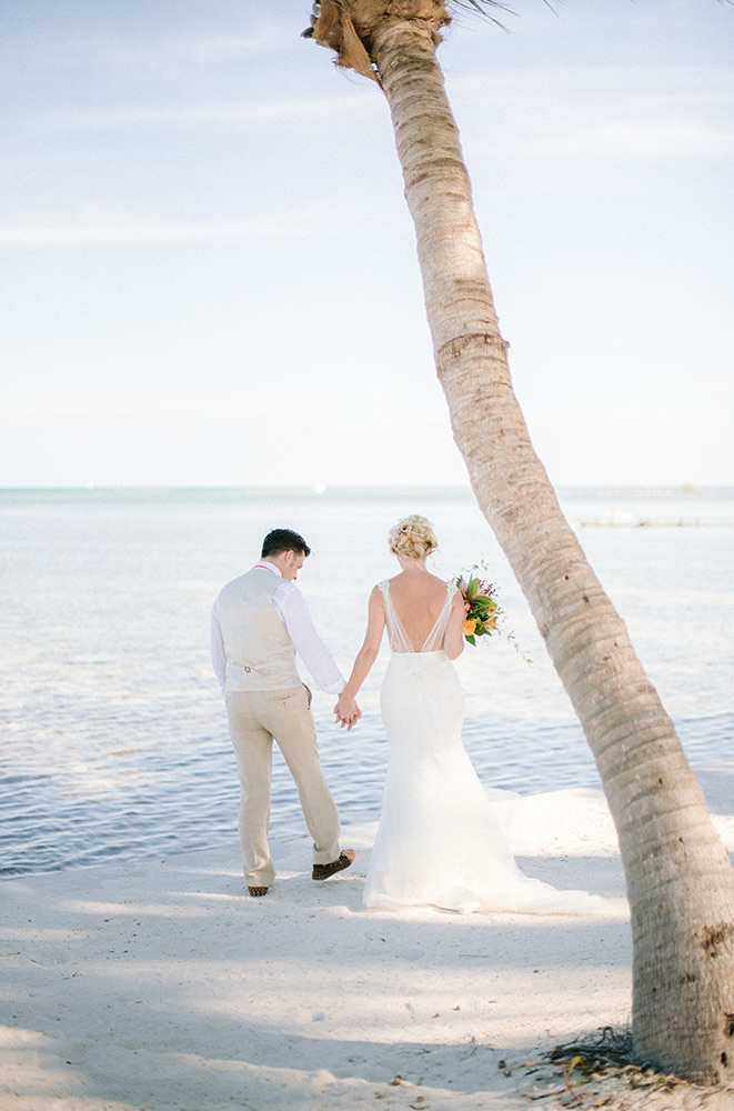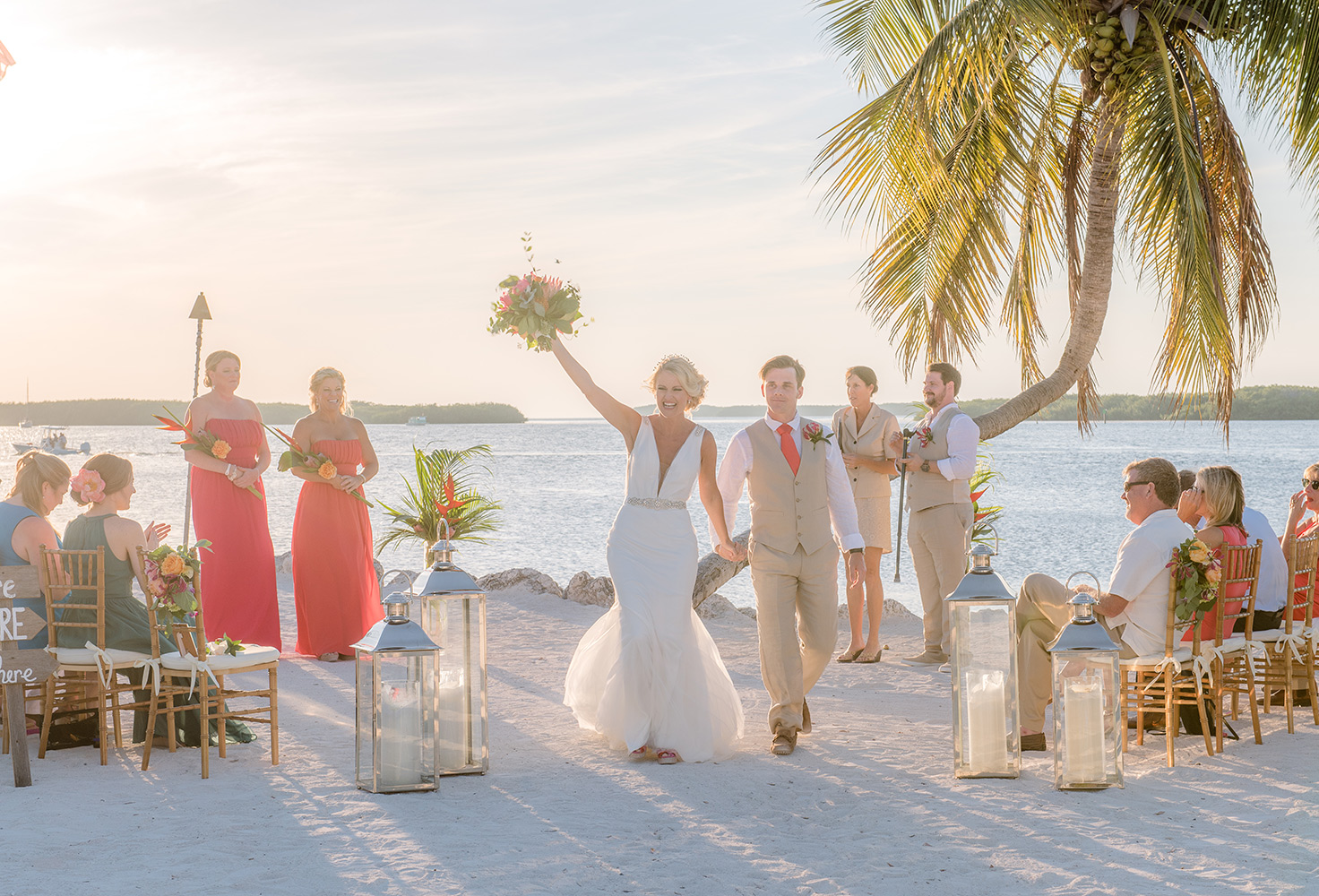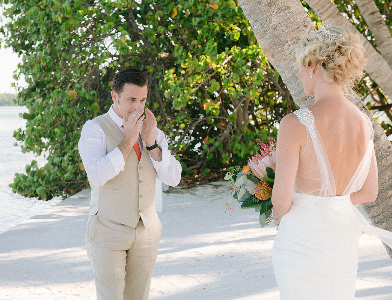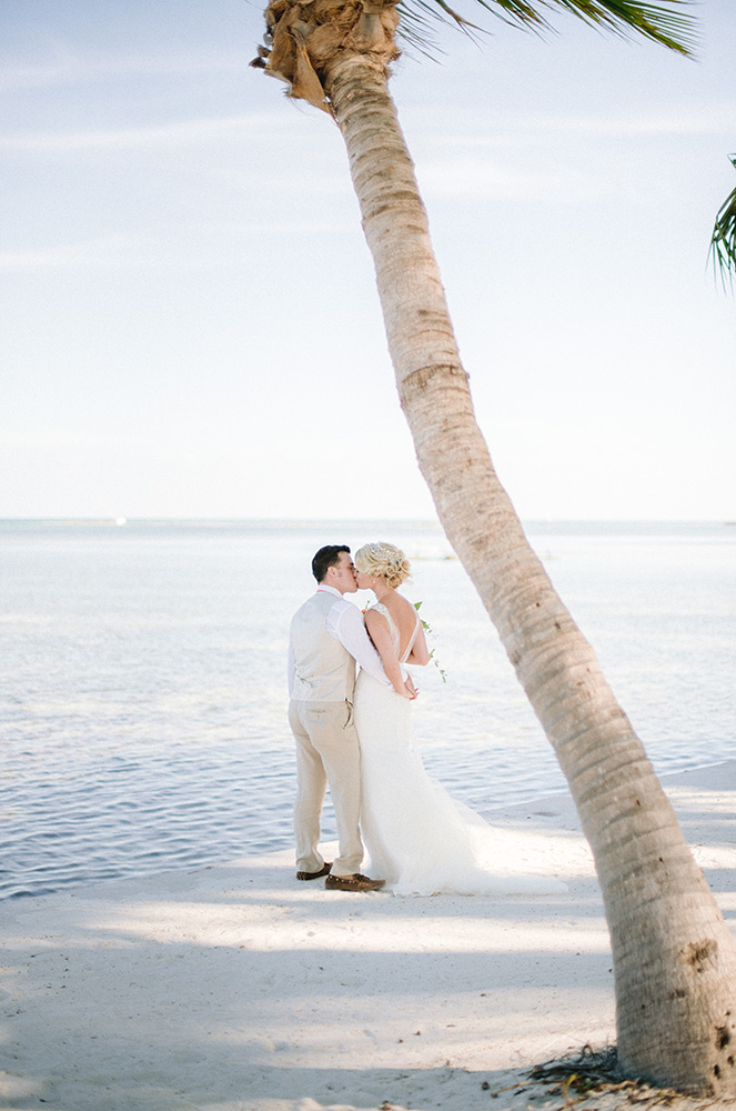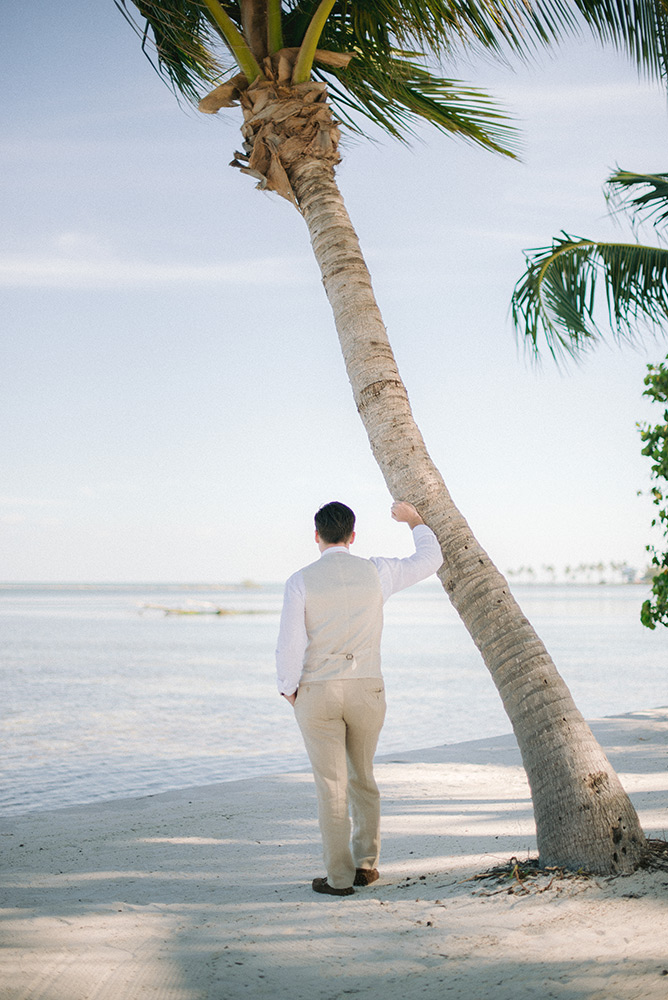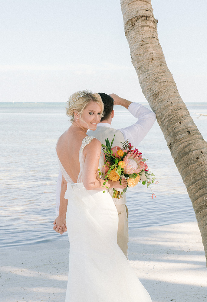 Sara & Daniel traveled all the way from the UK for their dream wedding in the Florida Keys. We met up with the bride and her girlfriends having a great time in the bridal suite at Amara Cay overlooking the beautiful Atlantic Ocean. The girls were sipping champagne upon our arrival, as we started to photograph her wedding day. We met Daniel & the guys downstairs in the bar as he was googling how to tie a tie and got a few fun shots. Then we were off to the beach for their first look. When Daniel turned to see his bride in her wedding dress, she took his breath away. Their ceremony venue was the beach at Pierres right next to the iconic bent palm tree overlooking the Gulf of Mexico, the best spot in town to watch a sunset.
