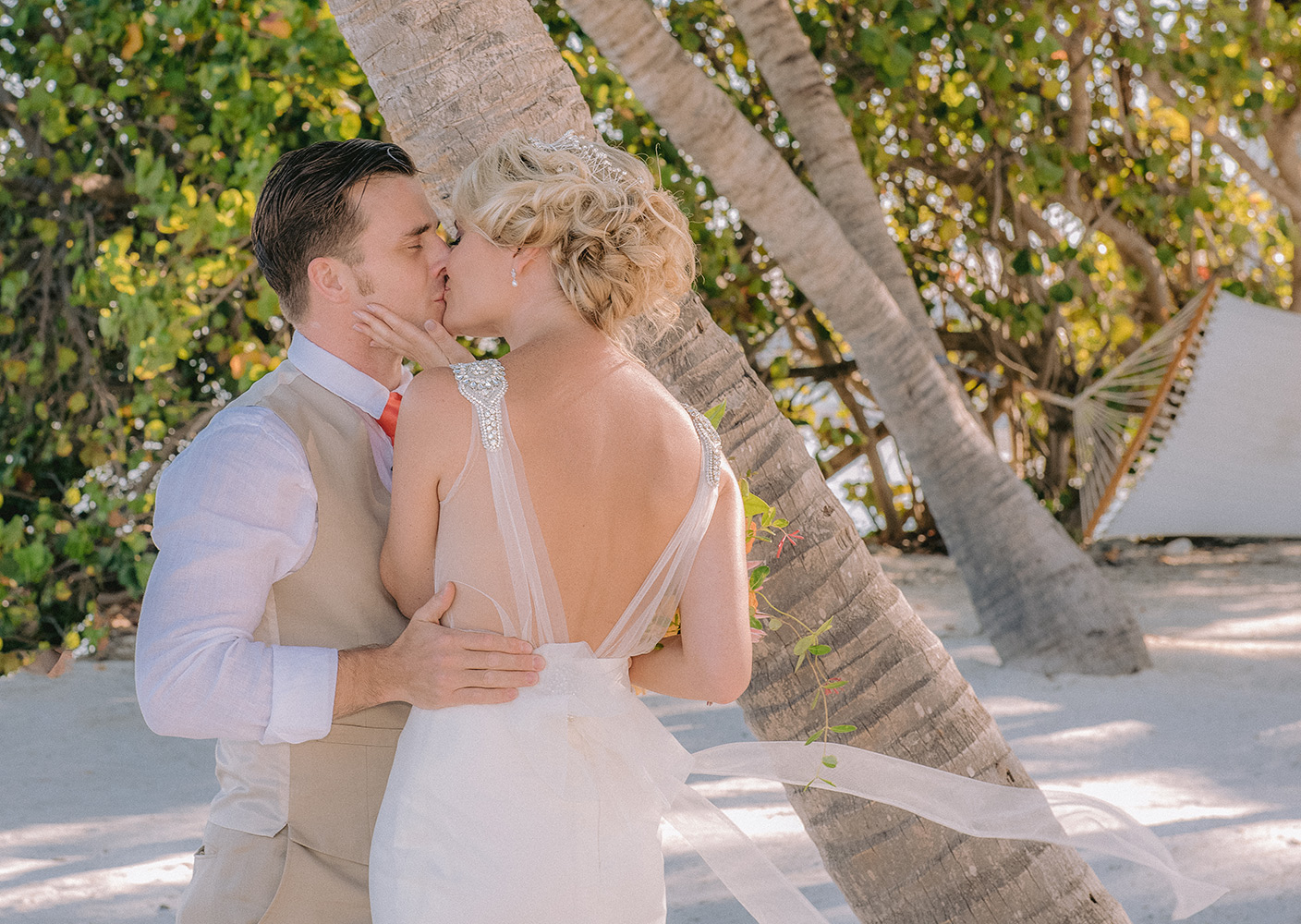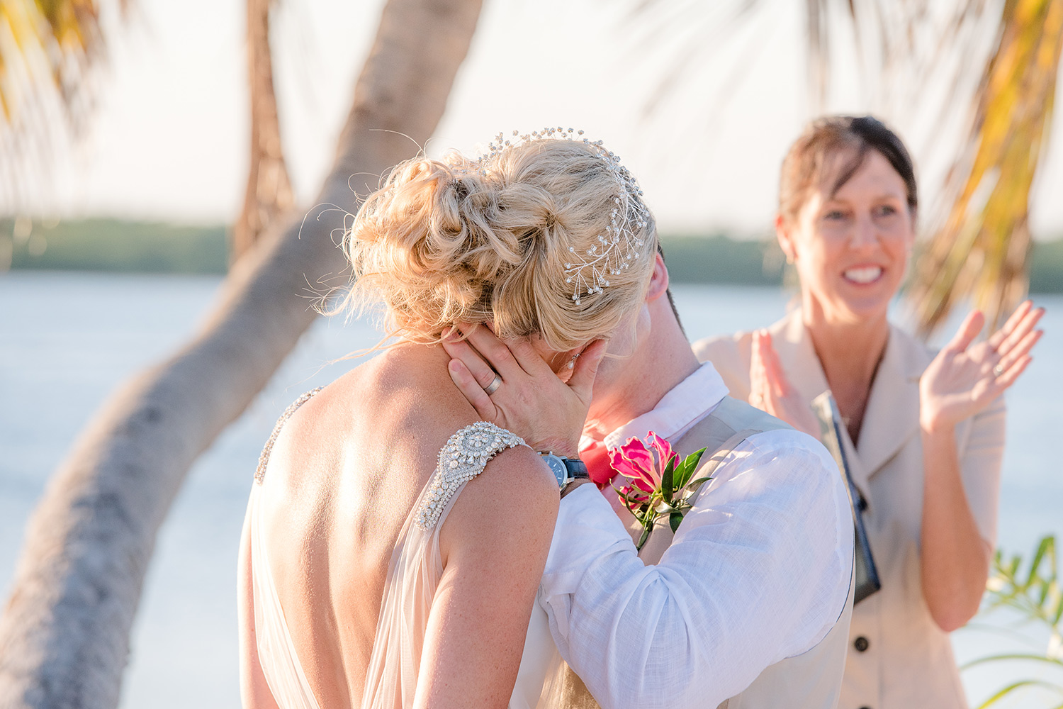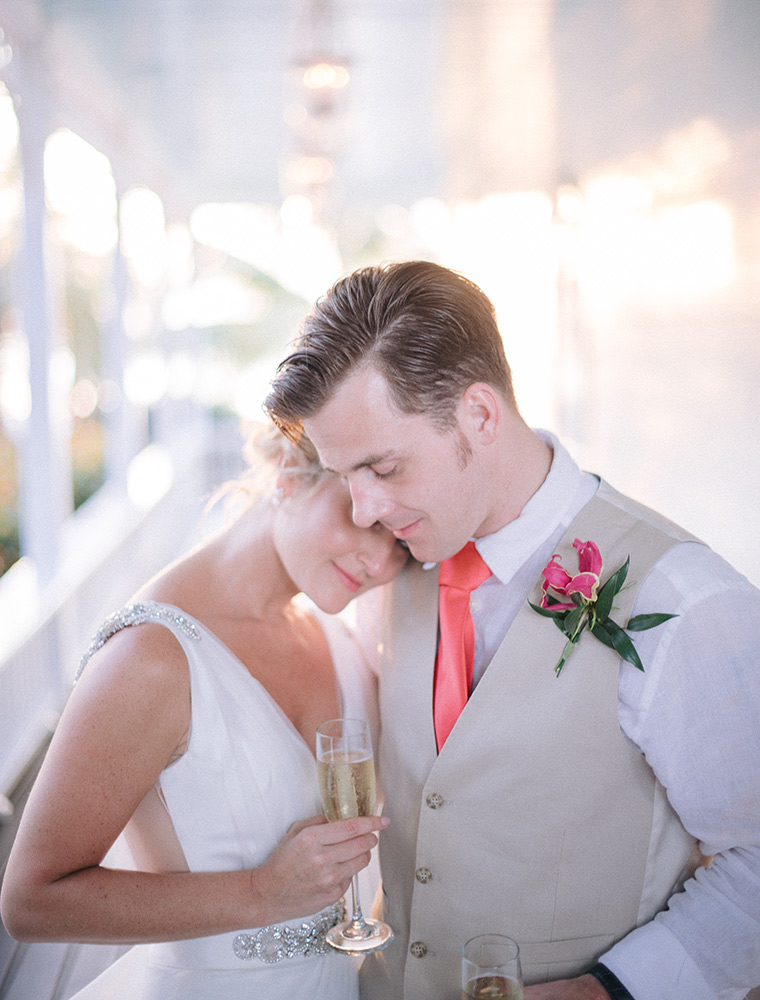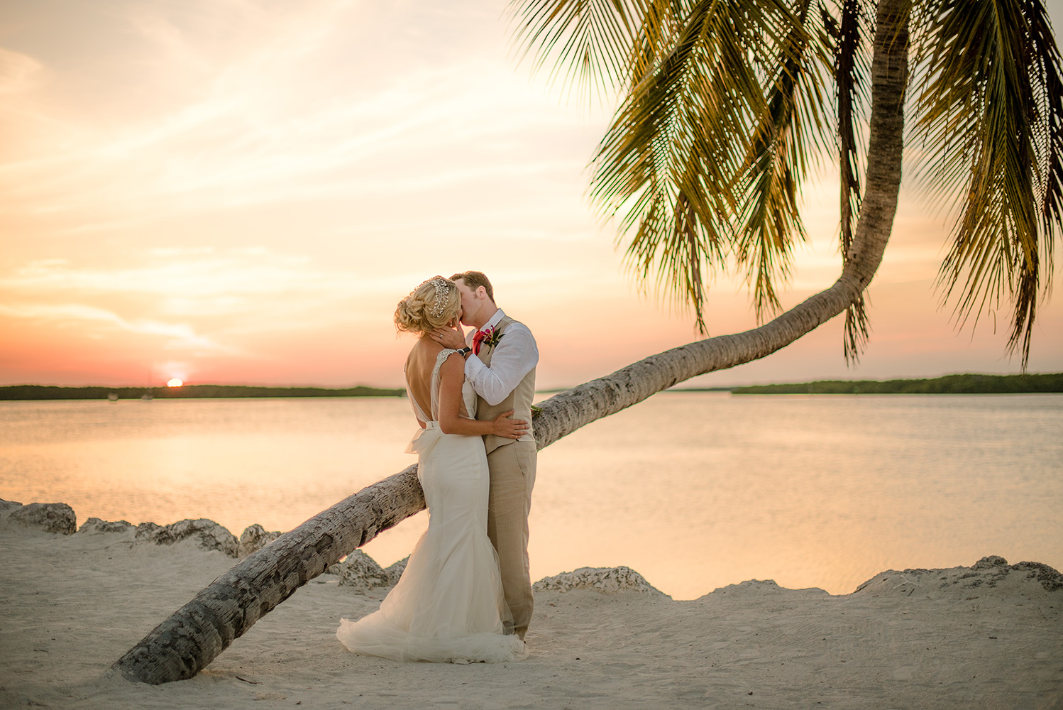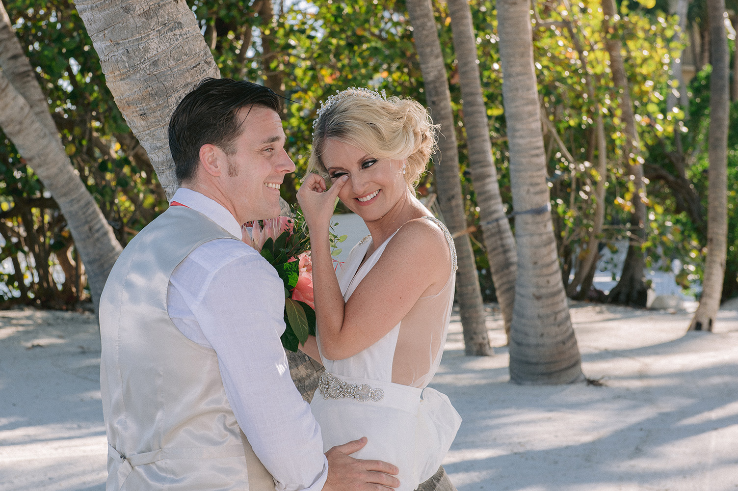 Sara & Daniel traveled all the way from the UK for their dream wedding in the Florida Keys. We met up with the bride and her girlfriends having a great time in the bridal suite at Amara Cay overlooking the beautiful Atlantic Ocean. The girls were sipping champagne upon our arrival, as we started to photograph her wedding day. We met Daniel & the guys downstairs in the bar as he was googling how to tie a tie and got a few fun shots. Then we were off to the beach for their first look. When Daniel turned to see his bride in her wedding dress, she took his breath away. Their ceremony venue was the beach at Pierres right next to the iconic bent palm tree overlooking the Gulf of Mexico, the best spot in town to watch a sunset.