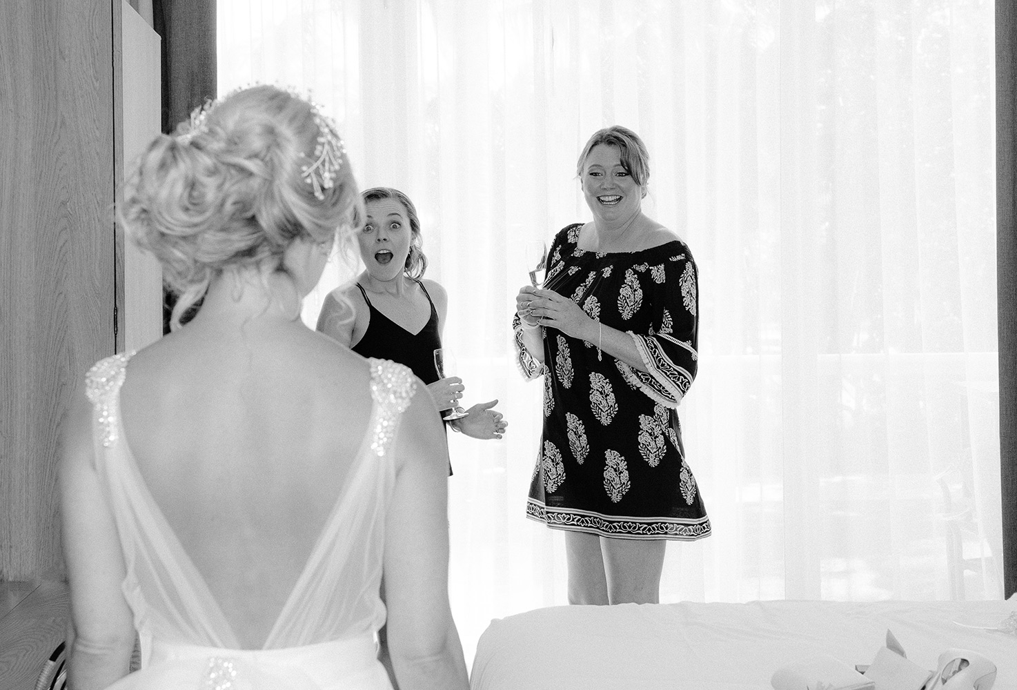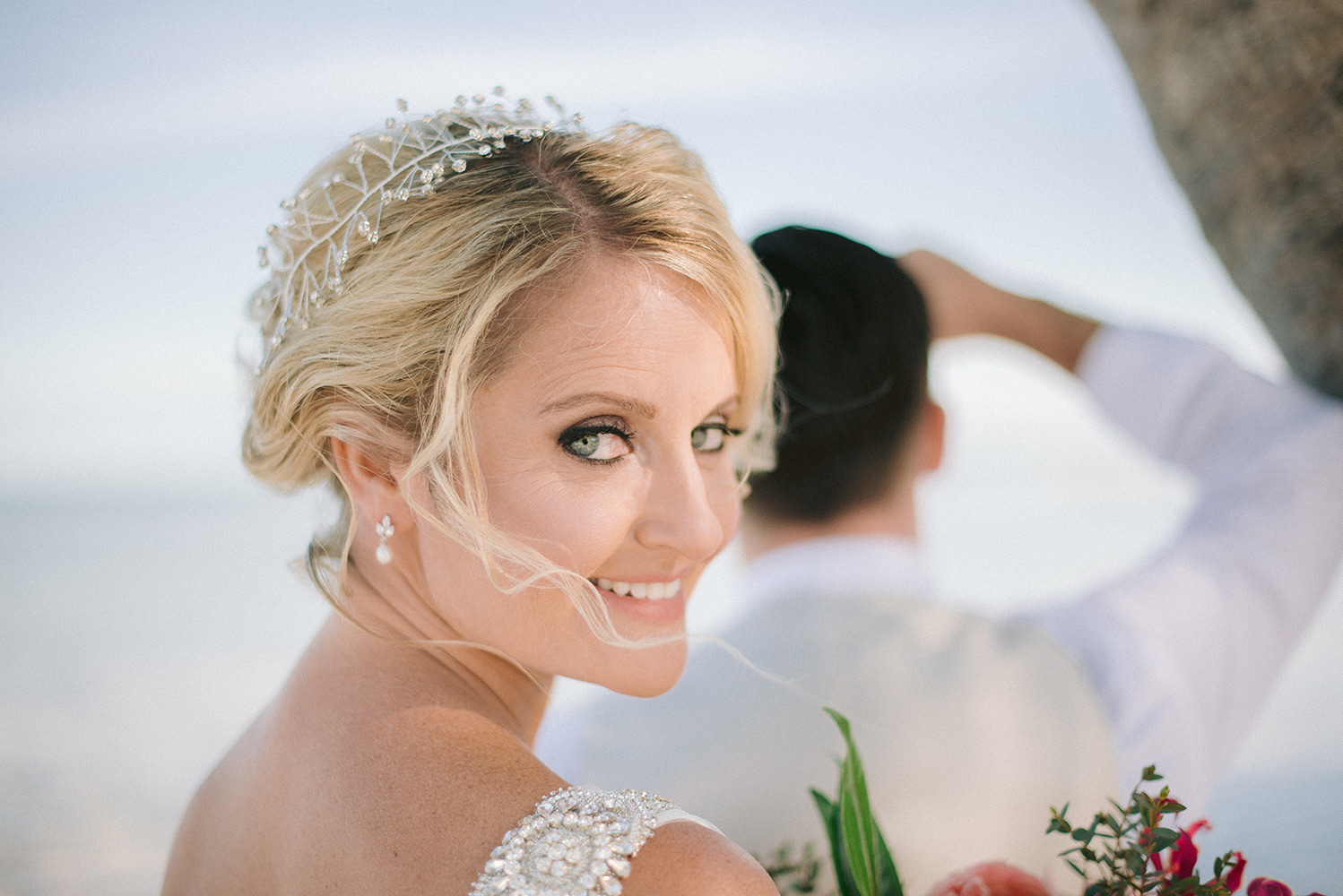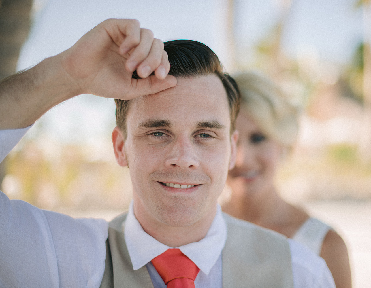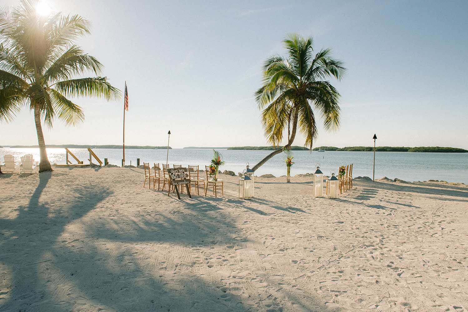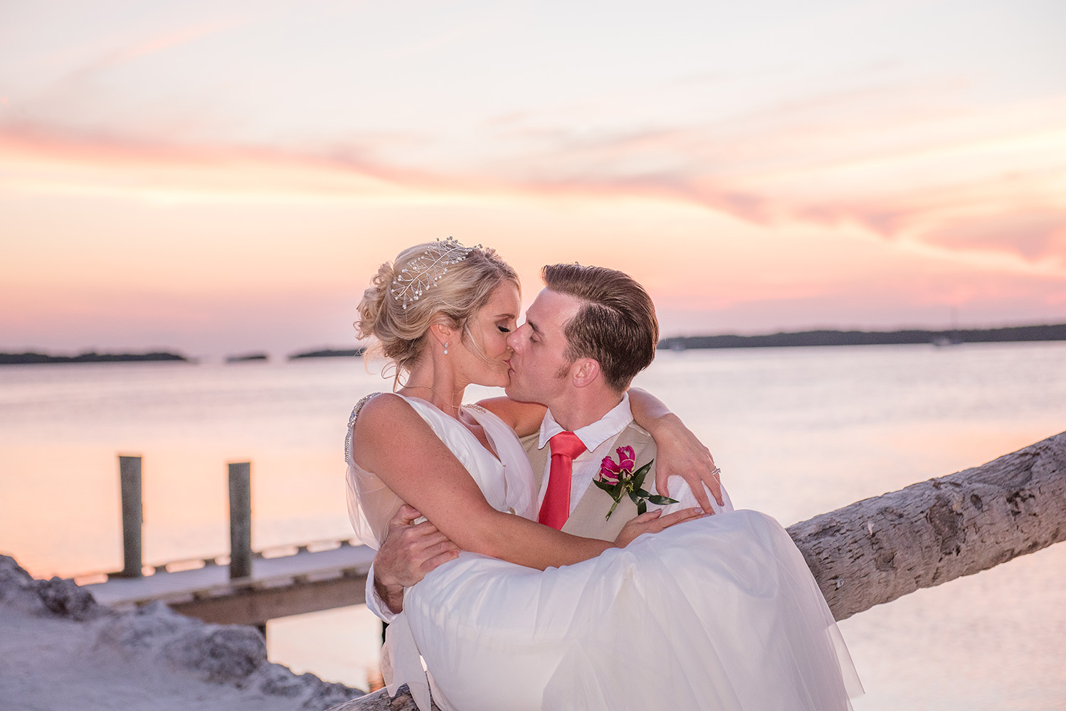 Sara & Daniel traveled all the way from the UK for their dream wedding in the Florida Keys. We met up with the bride and her girlfriends having a great time in the bridal suite at Amara Cay overlooking the beautiful Atlantic Ocean. The girls were sipping champagne upon our arrival, as we started to photograph her wedding day. We met Daniel & the guys downstairs in the bar as he was googling how to tie a tie and got a few fun shots. Then we were off to the beach for their first look. When Daniel turned to see his bride in her wedding dress, she took his breath away. Their ceremony venue was the beach at Pierres right next to the iconic bent palm tree overlooking the Gulf of Mexico, the best spot in town to watch a sunset.